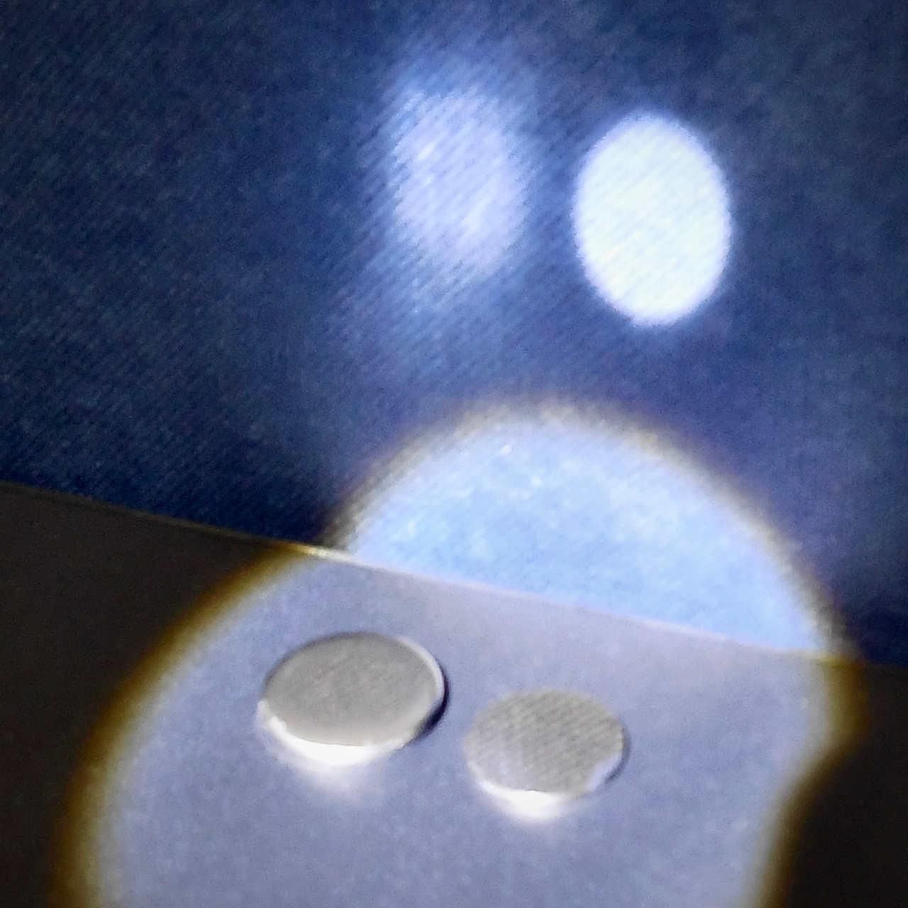 左の円盤が一般研磨品、右の円盤がナノフラ加工品です。素材はどちらもサージカルステンレスです。