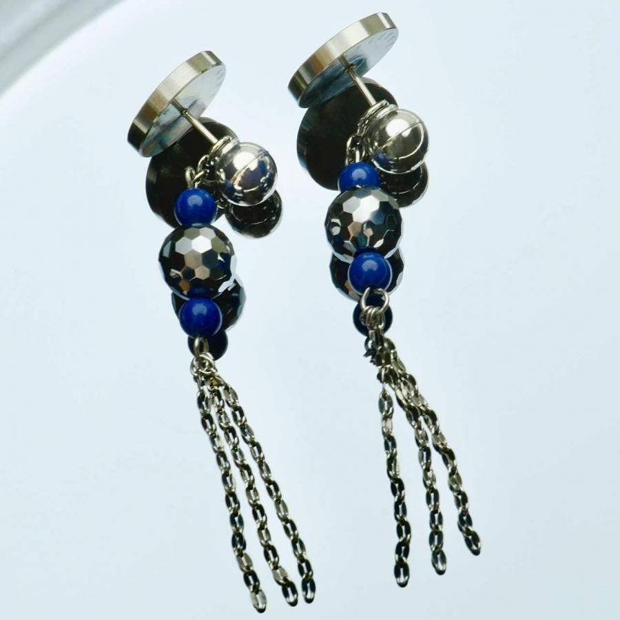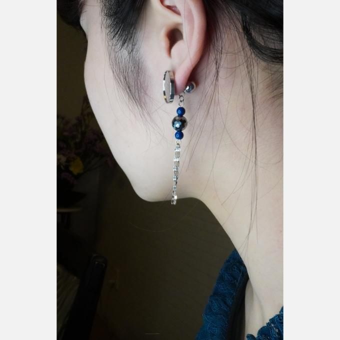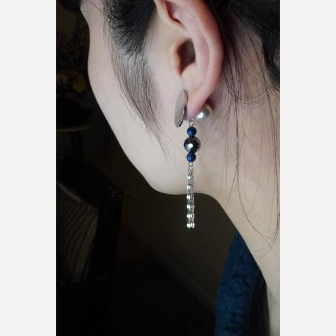 [8HTH]は、多面カットを施した大粒のSi(シリコン)と繊細で煌めき感のあるチェーンをタッセル状にして組み合わせ、全面が美しく輝く金属製の風鈴のイメージを具現化しました。Siとチェーンのシルバーの輝きが凛とした力強さを感じさせてくれます。また、差し色として加えた北投石は、珍しいダークブルーのものを選定し、その深みのある青色が落ち着いた雰囲気もプラスしてくれます。