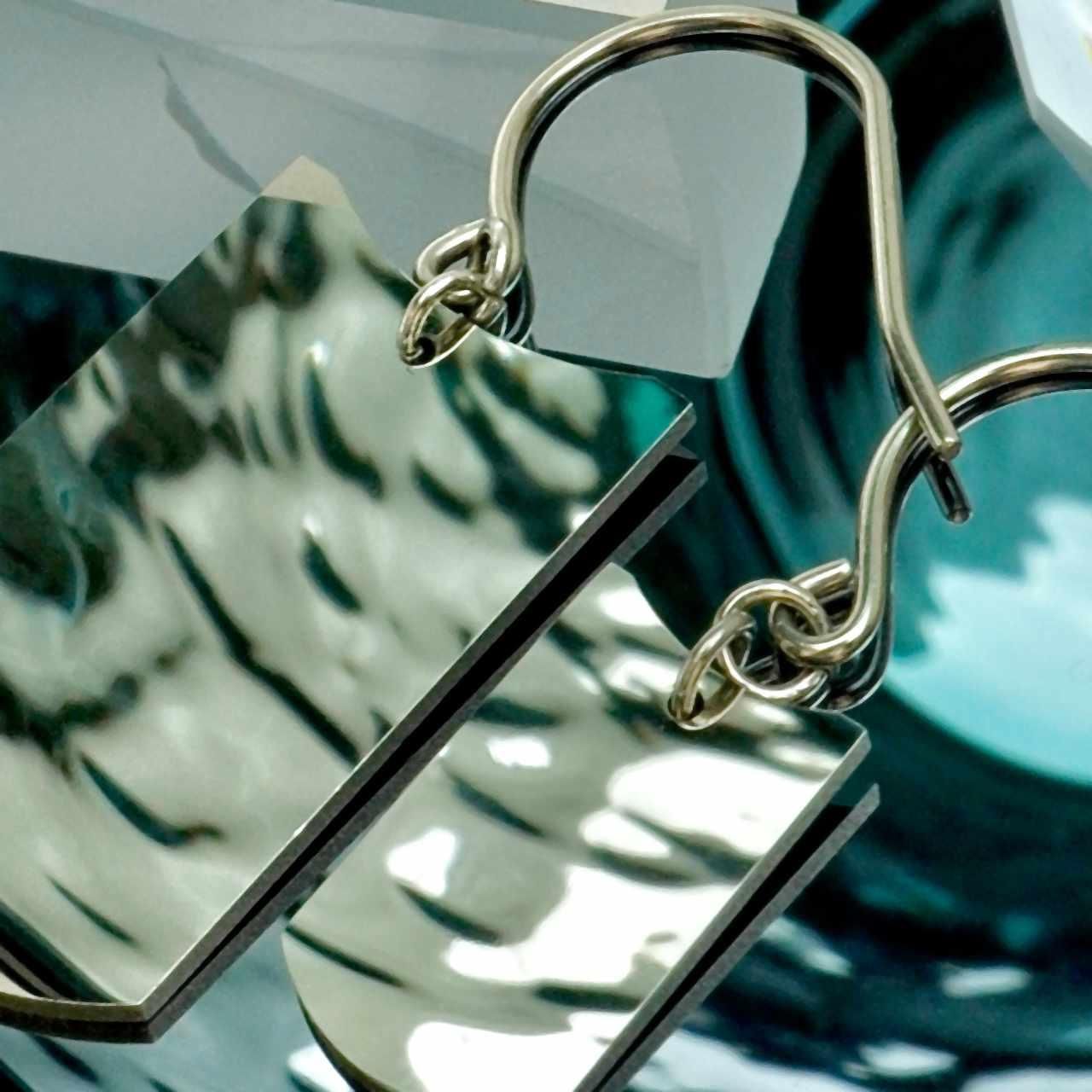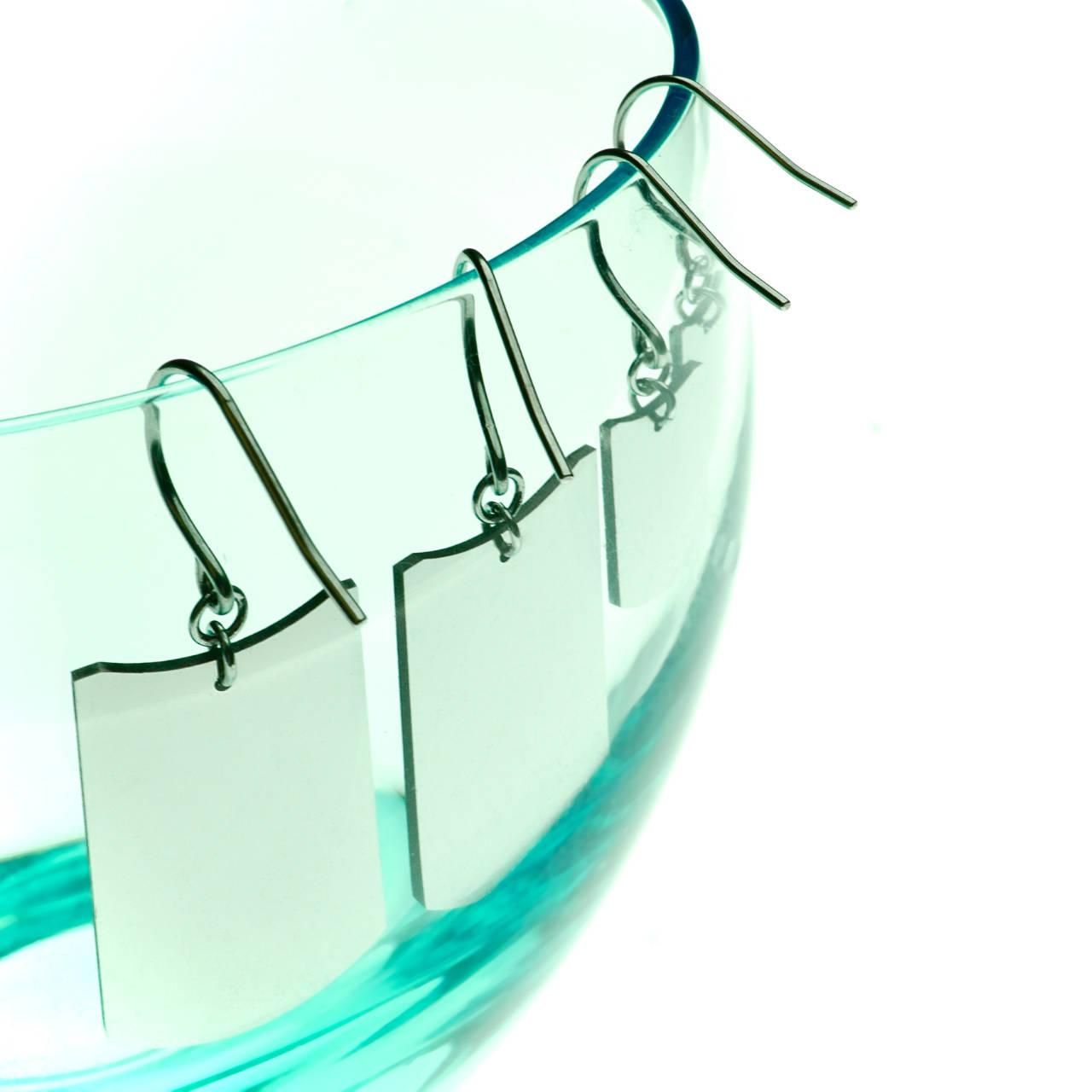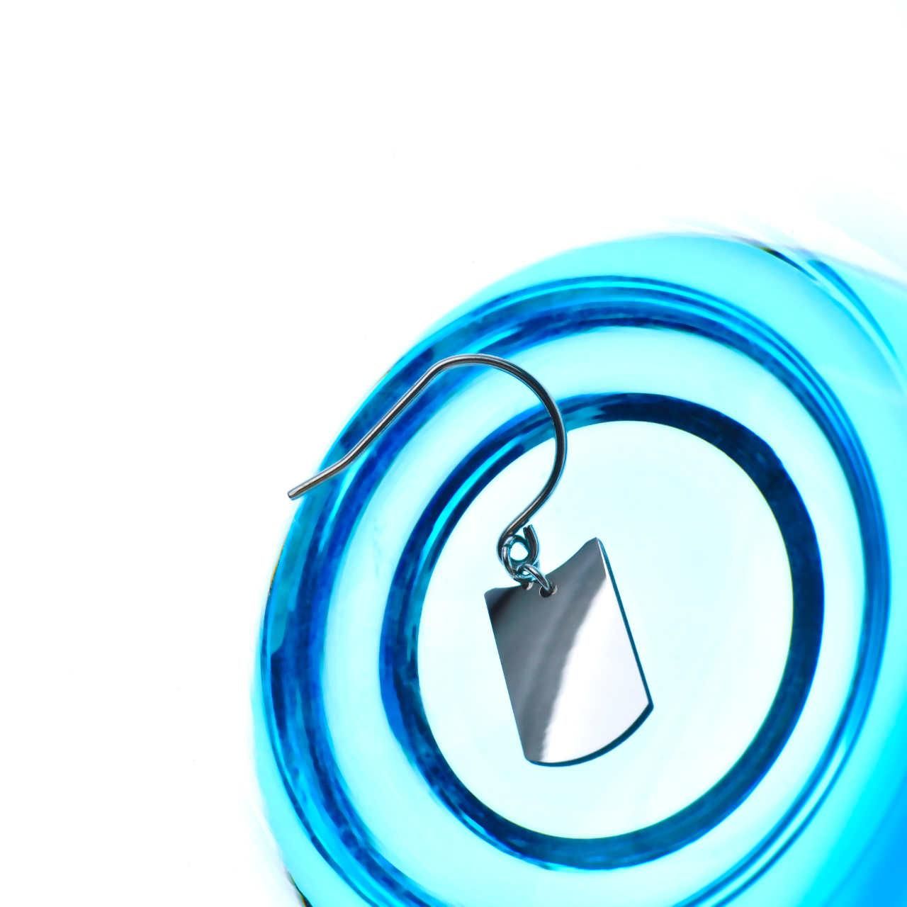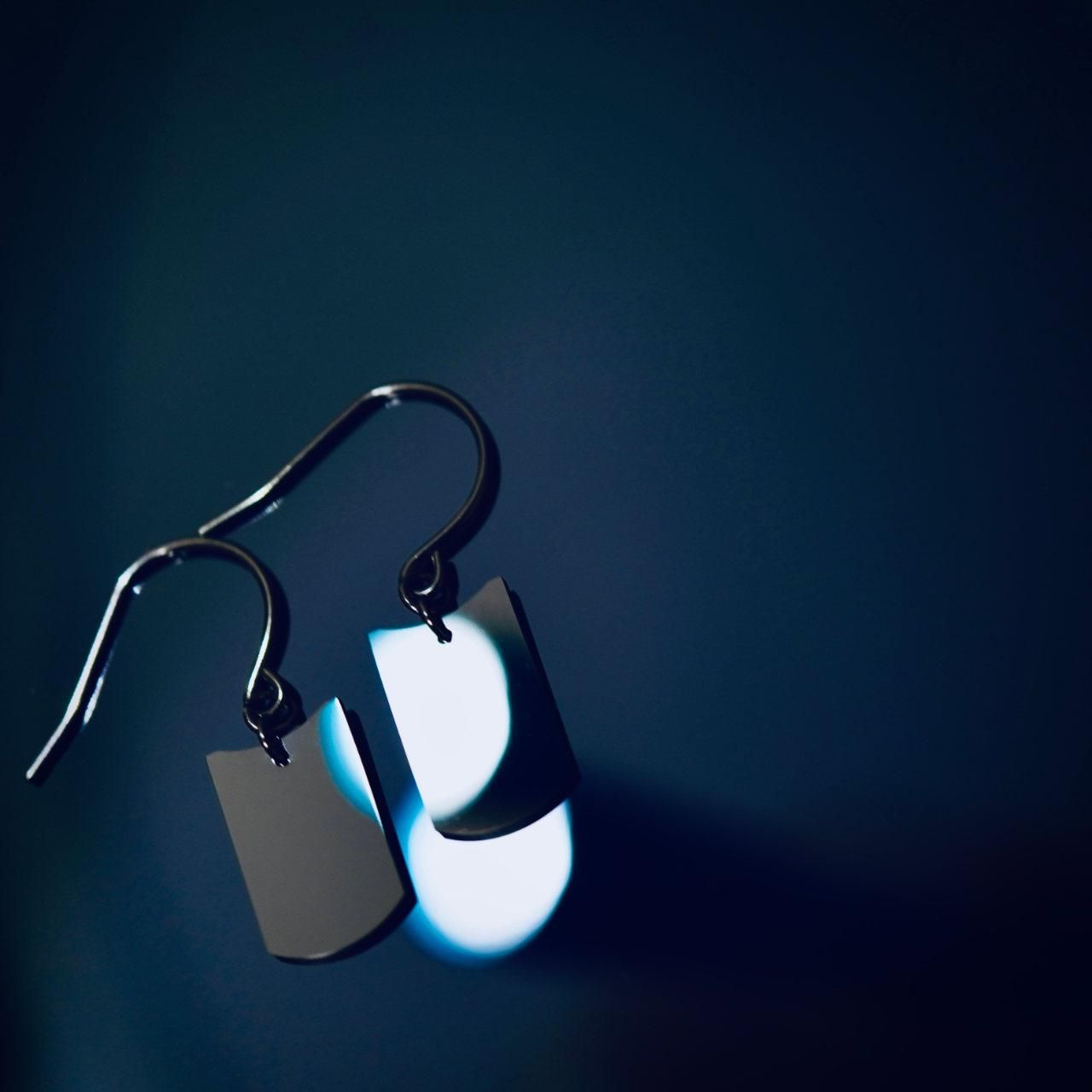 タグの両面が超鏡面に磨かれているので、揺れるたびに360°どの方向からでも美しく煌めき、小ぶりながらも存在感があるピアスです。通常のネームタグの形とは異なり上側のカーブが耳たぶの形に沿ったカーブになっているので、シャープで洗練された印象も与えてくれます。